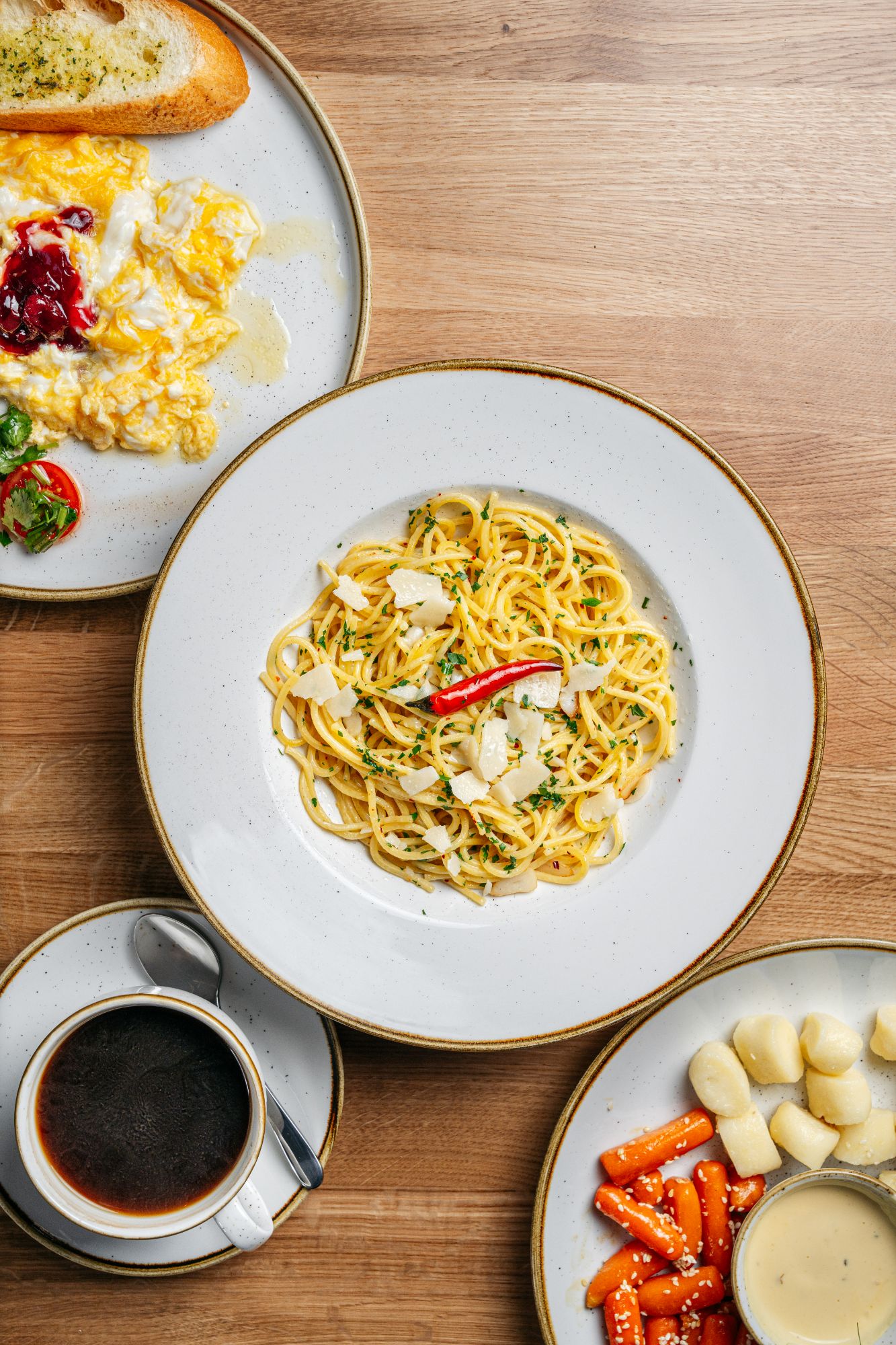 Każdy dzień zaczynamy od niezwykłych śniadań i dobrej kawy a później przechodzimy na wyższe obroty i szykujemy obiady, które dają wytchnienie w środku dnia i pobudzają wszystkie zmysły sprawiając, że chce się do nas wracać.
